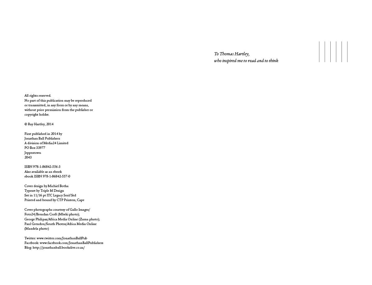 © Ray Hartley, 2014 First published in 2014 by Jonathan Ball Publishers ISBN 978-1-86842-556-3 ebook ISBN 978-1-86842-557-0 Cover design by Michiel Botha Typeset by Triple M Design Set in 11/16 pt ITC Legacy Serif Std Printed and bound by CTP Printers, Cape Cover photographs courtesy of Gallo Images/ Foto24/Brendan Croft (Mbeki photo); George Philipas/Africa Media Online (Zuma photo); Paul Grendon/South Photos/Africa Media Online (Mandela photo)