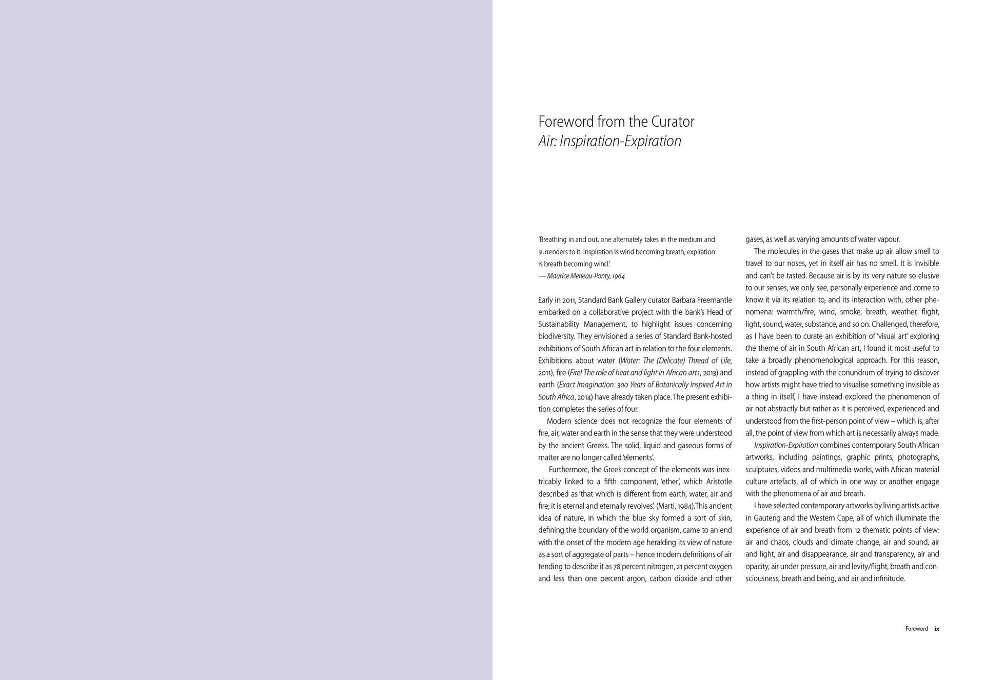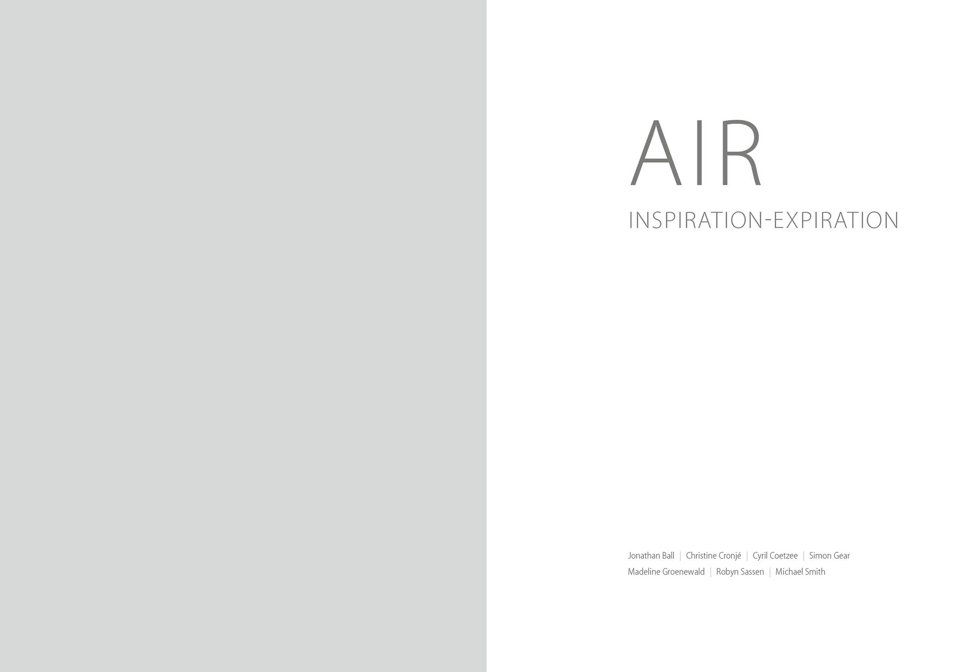 This catalogue was published to accompany the exhibition Air: Inspiration-Expiration Standard Bank Gallery, Johannesburg 8 October to 3 December 2016 Conception: Cyril Coetzee Editor: Cyril Coetzee Contributors: Jonathan Ball, Christine Cronjé, Cyril Coetzee, Simon Gear, Madeline Groenewald, Robyn Sassen, Michael Smith. Copy editing: Tracey Hawthorne, Susan Isaac. Design and Layout: Triple M Design Images: Cliff Shain, photographer, Standard Bank of South Africa Limited, Thys Dullart (for Robyn Penn). ISBN 978-0-620-72075-5