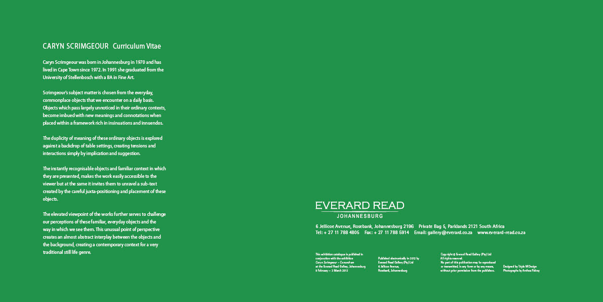 This exhibition catalogue was published in conjunction with the xhibition 'Caryn Scrimgeour – Conundrum' at the Everard Read Gallery, Johannesburg 9 February — 3 March 2012 Photographs by Anthea Pokroy