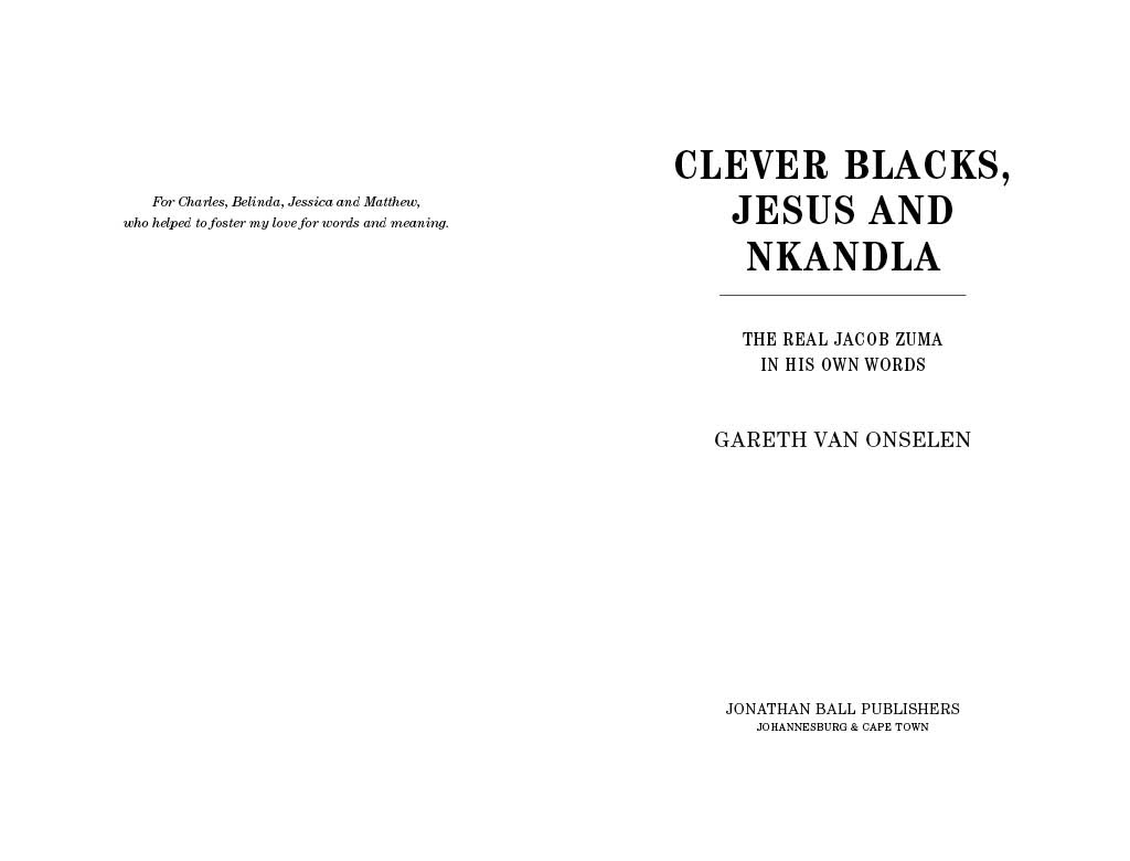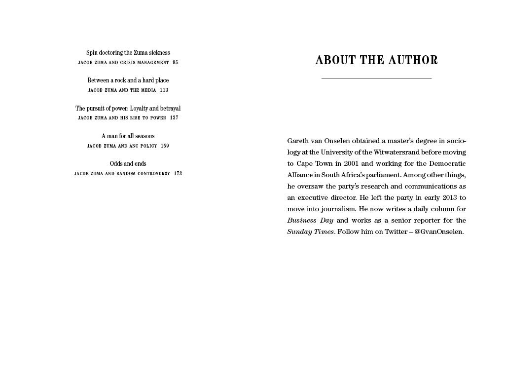 © Gareth van Onselen, 2014 Originally published in South Africa in 2014 by JONATHAN BALL PUBLISHERS (PTY) LTD ISBN 978-1-86842-618-8 eBook ISBN 978-1-86842-619-5 Cover by Publicide Design and typesetting by Triple M Design, Johannesburg Printed and bound by Paarl Media, Paarl Set in 9,5/13,5pt ITC Century Std