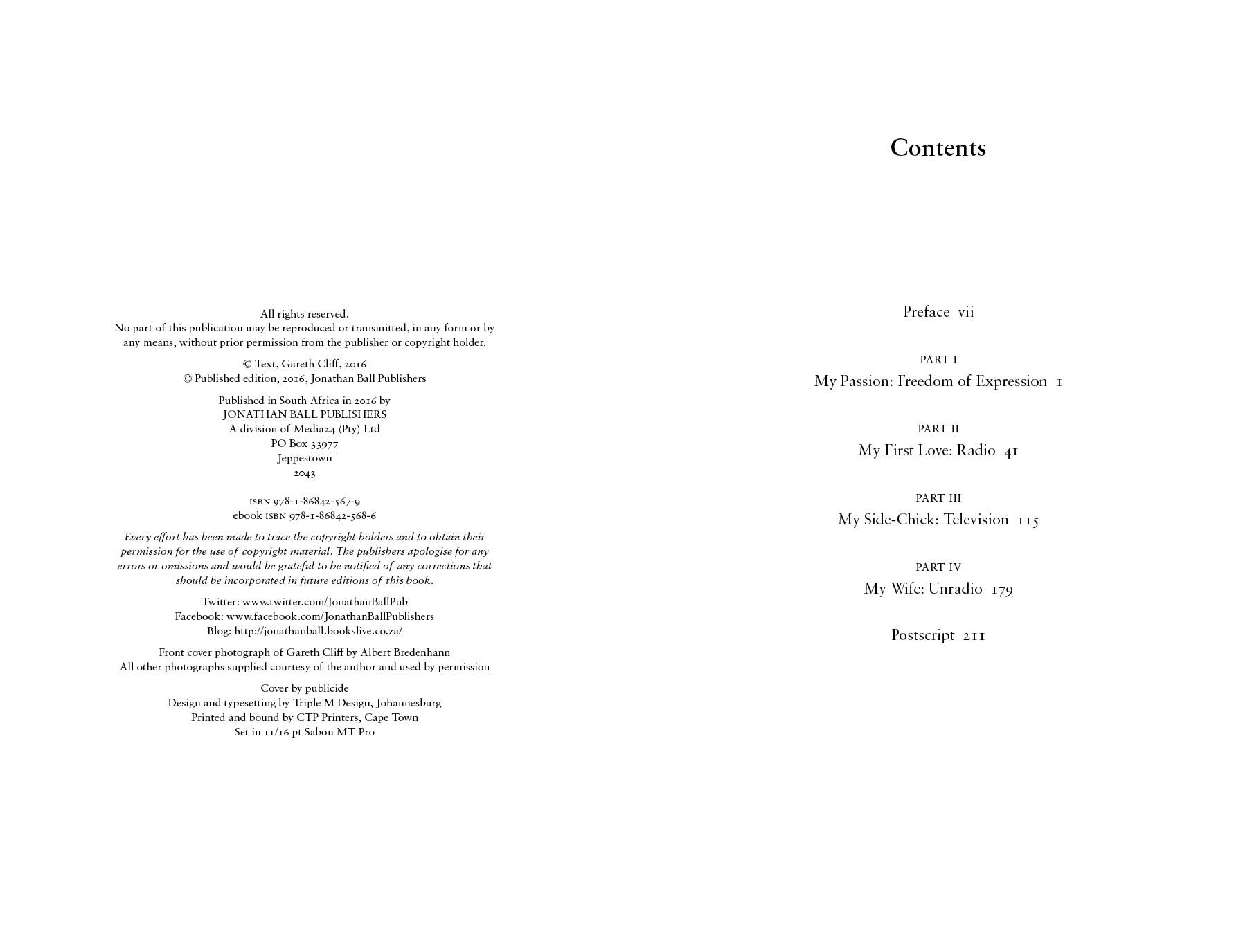 © Text, Gareth Cliff, 2016 © Published edition, 2016, Jonathan Ball Publishers Published in South Africa in 2016 by JONATHAN BALL PUBLISHERS ISBN 978-1-86842-567-9 EBOOK ISBN 978-1-86842-568-6 Front cover photograph of Gareth Cliff by Albert Bredenhann Cover by publicide