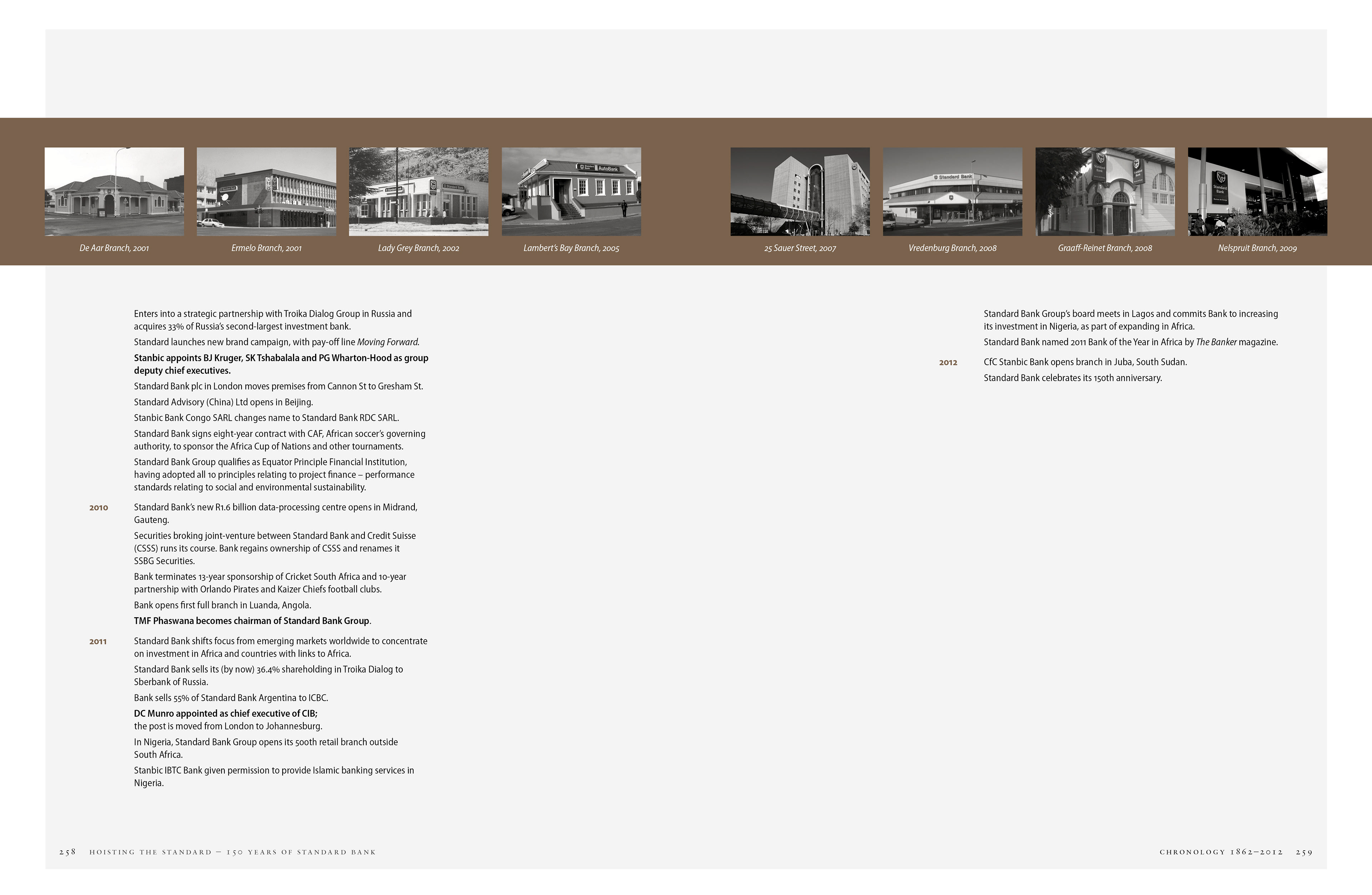 Hoisting the Standard: 150 Years of Standard Bank Client: Standard Bank Size: 230 x 300 mm Extent: 289 pages Binding: Hard cover with a 7 process french fold dust jacket, and a hard slip case. Printed by: Ultra Litho Johannesburg Date: 2012