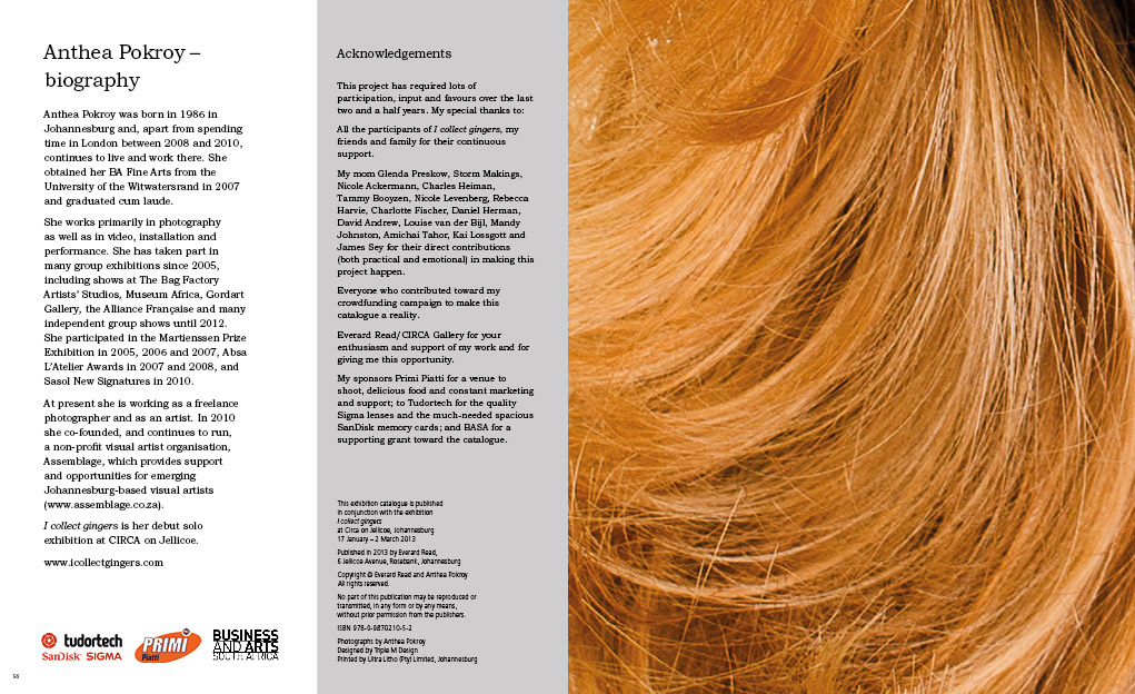 'I Collect Gingers' Catalogue for the exhibition at Speke Photographic (Johannesburg, South Africa) for artist Anthea Pokory. Published in 2013 by Everard Read Photographs by Anthea Pokroy Printed by Ultra Litho (Pty) Limited, Johannesburg