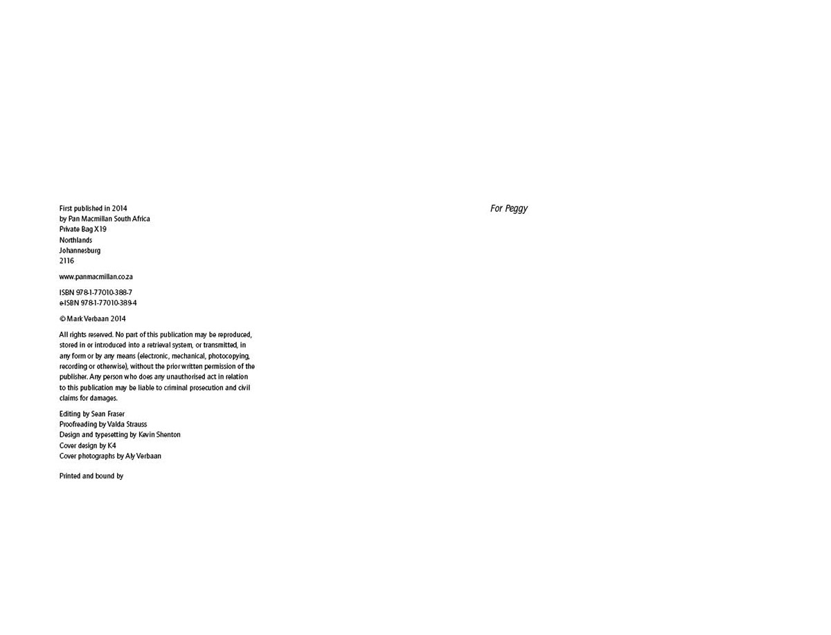 First published in 2014 by Pan Macmillan South Africa ISBN 978-1-77010-388-7 e-ISBN 978-1-77010-389-4 © Mark Verbaan 2014 Design and typesetting by Kevin Shenton Cover design by K4 Cover photographs by Aly Verbaan