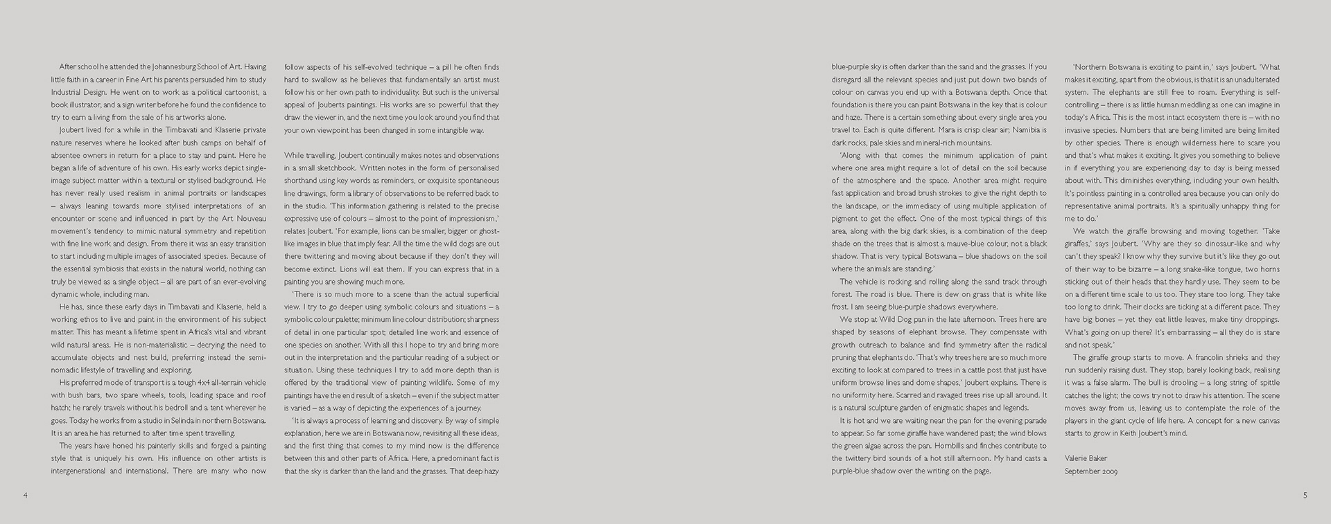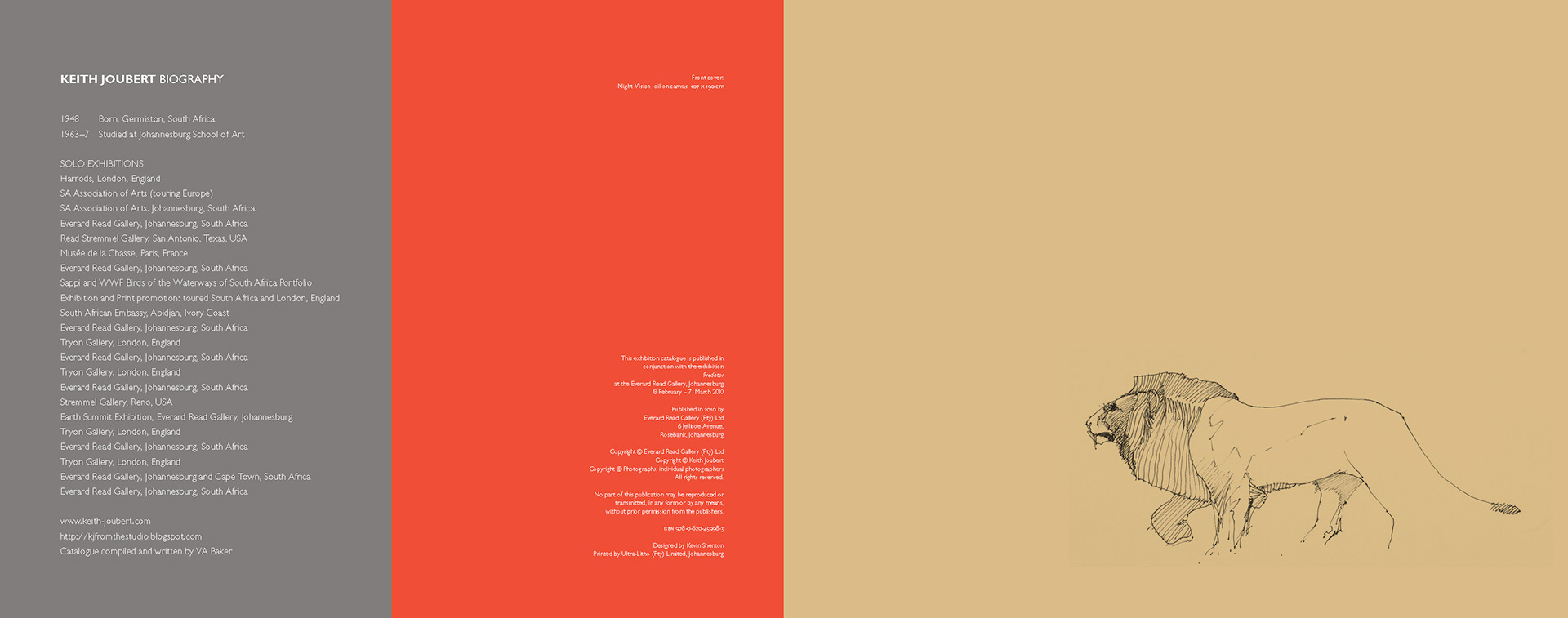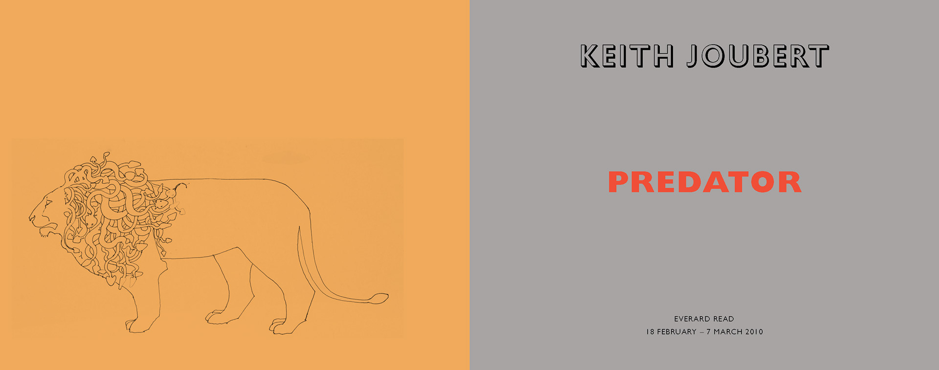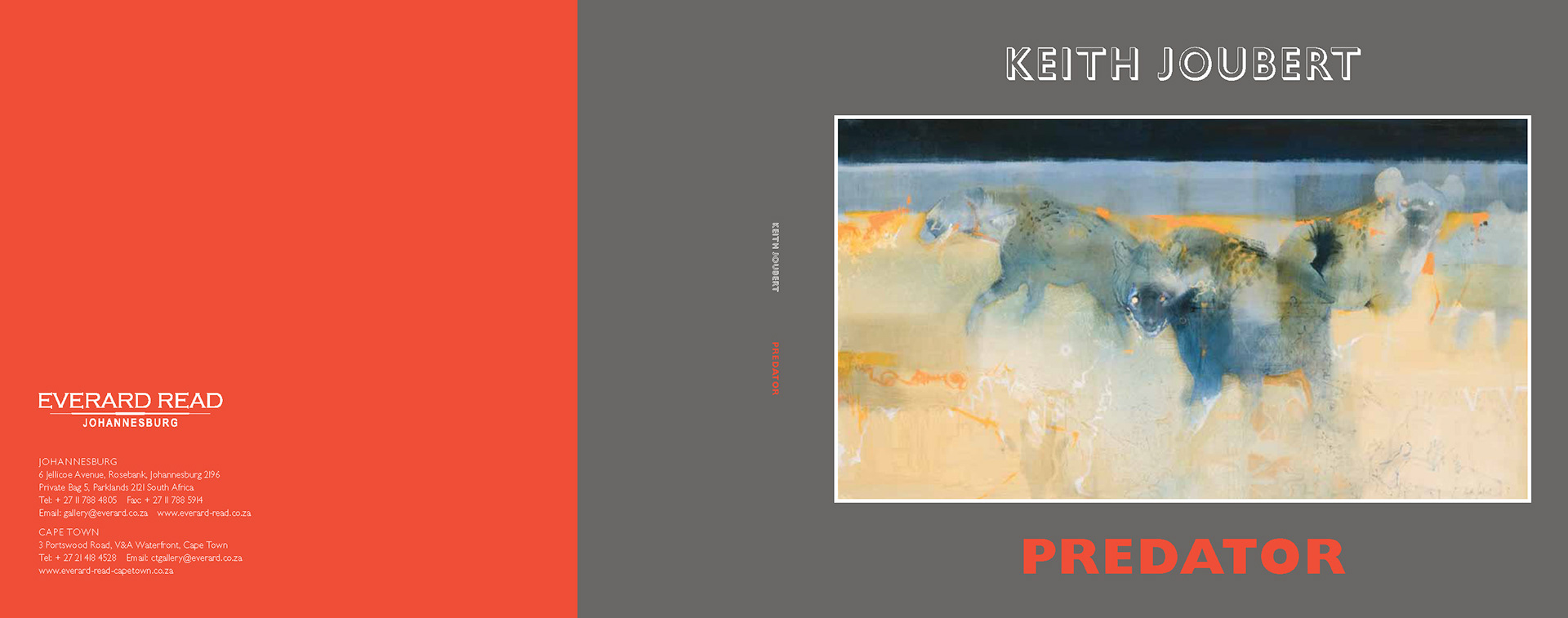 This exhibition catalogue was published in conjunction with the exhibition 'Predator' by Keith Joubert at the Everard Read Gallery, Johannesburg 18 February – 7 March 2010 Published in 2010 by Everard Read Gallery (Pty) Ltd Designed by Kevin Shenton Printed by Ultra-Litho (Pty) Limited, Johannesburg