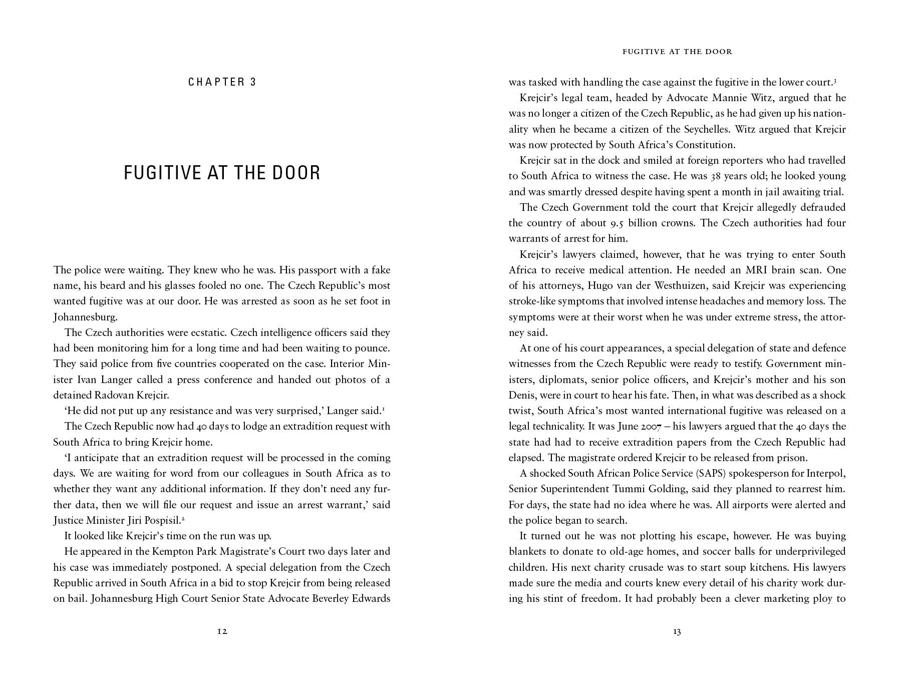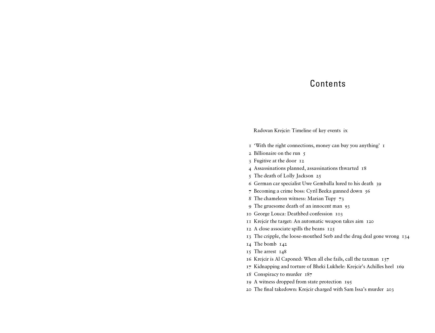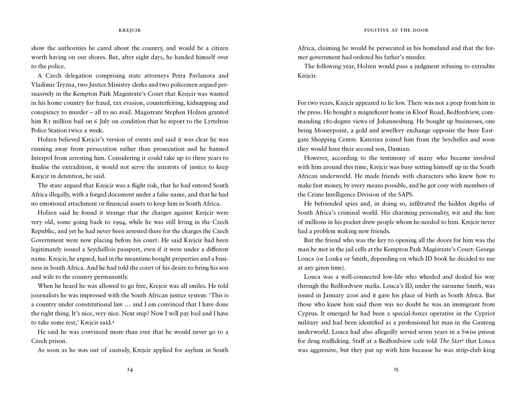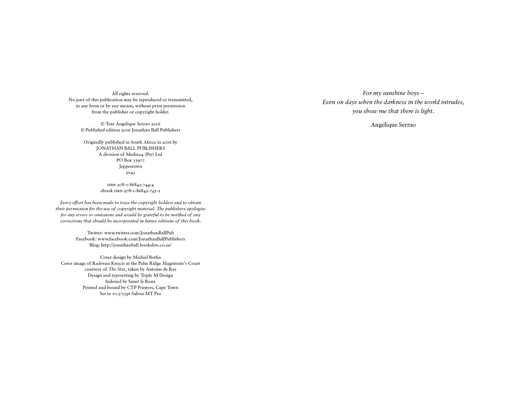© Text Angelique Serrao 2016 © Published edition 2016 Jonathan Ball Publishers Originally published in South Africa in 2016 by JONATHAN BALL PUBLISHERS ISBN 978-1-86842-744-4 Cover design by Michiel Botha Cover image of Radovan Krejcir at the Palm Ridge Magistrate’s Court courtesy of The Star, taken by Antoine de Ras