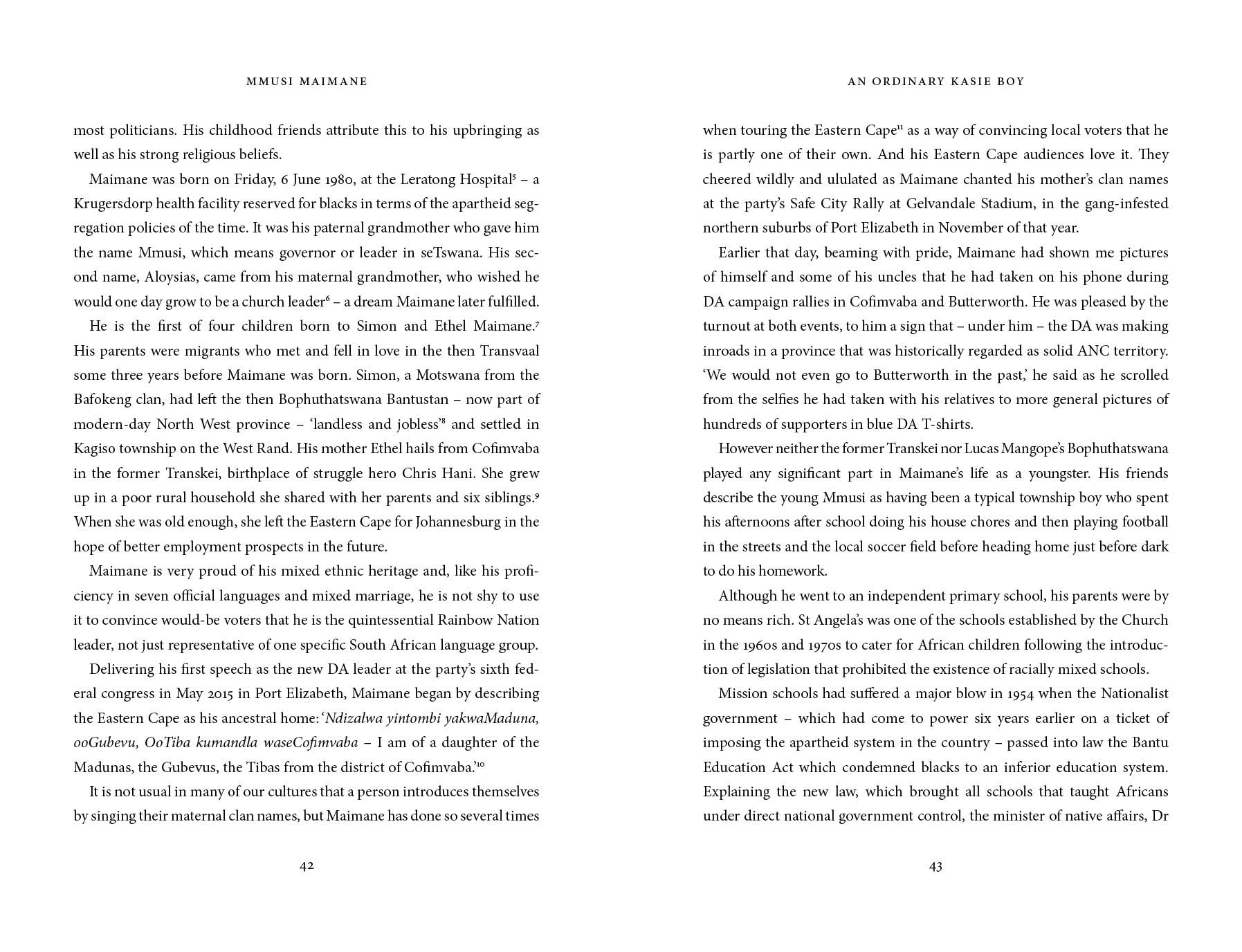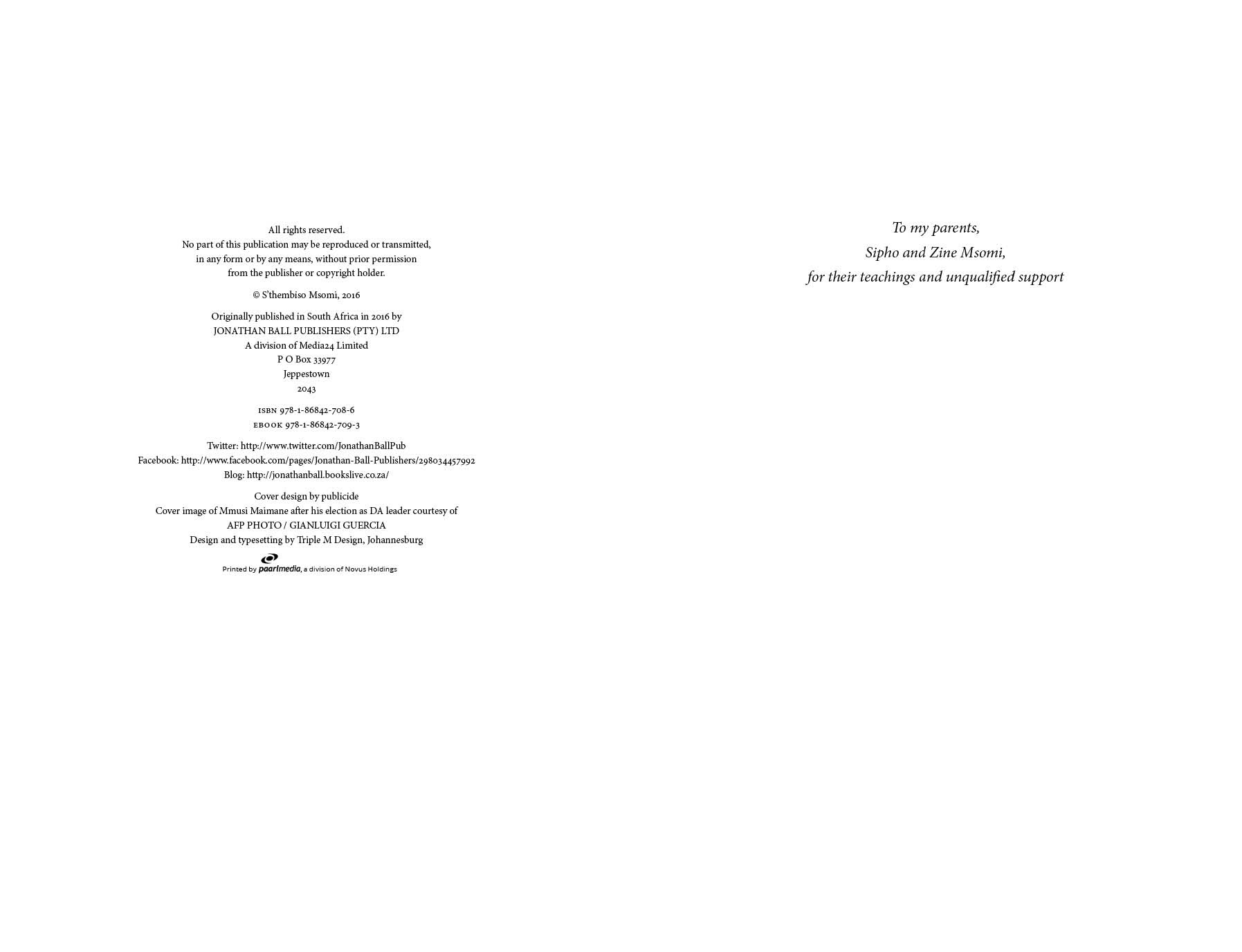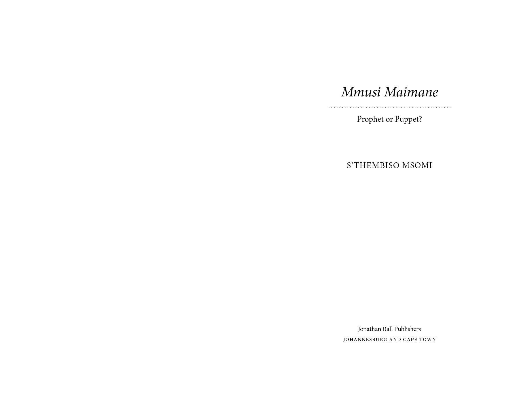 Mmusi Maimane Prophet or Puppet? © S’thembiso Msomi, 2016 Originally published in South Africa in 2016 by JONATHAN BALL PUBLISHERS (PTY) LTD ISBN 978-1-86842-708-6 Cover design by publicide Cover image of Mmusi Maimane after his election as DA leader courtesy of AFP PHOTO / GIANLUIGI GUERCIA Design and typesetting by Triple M Design