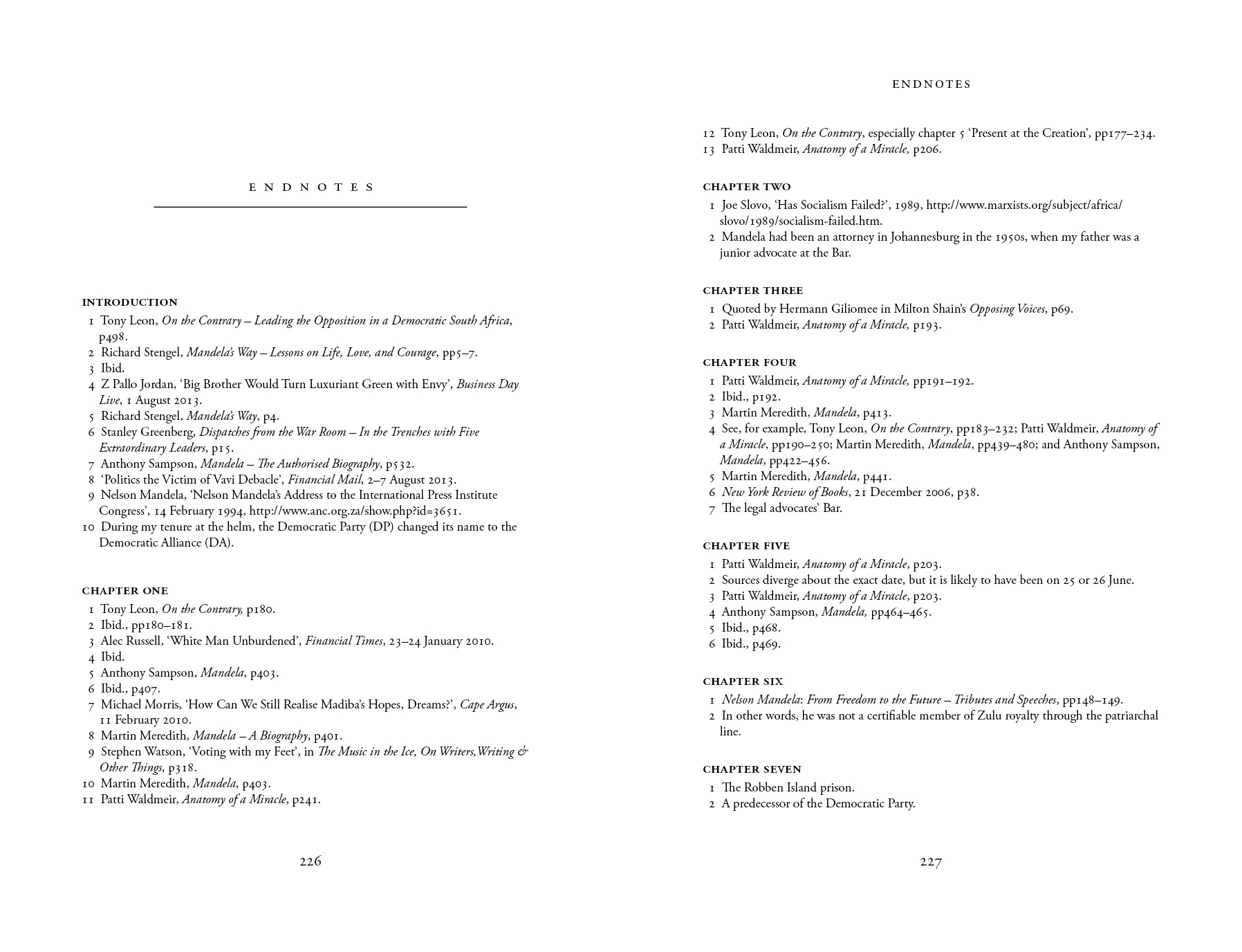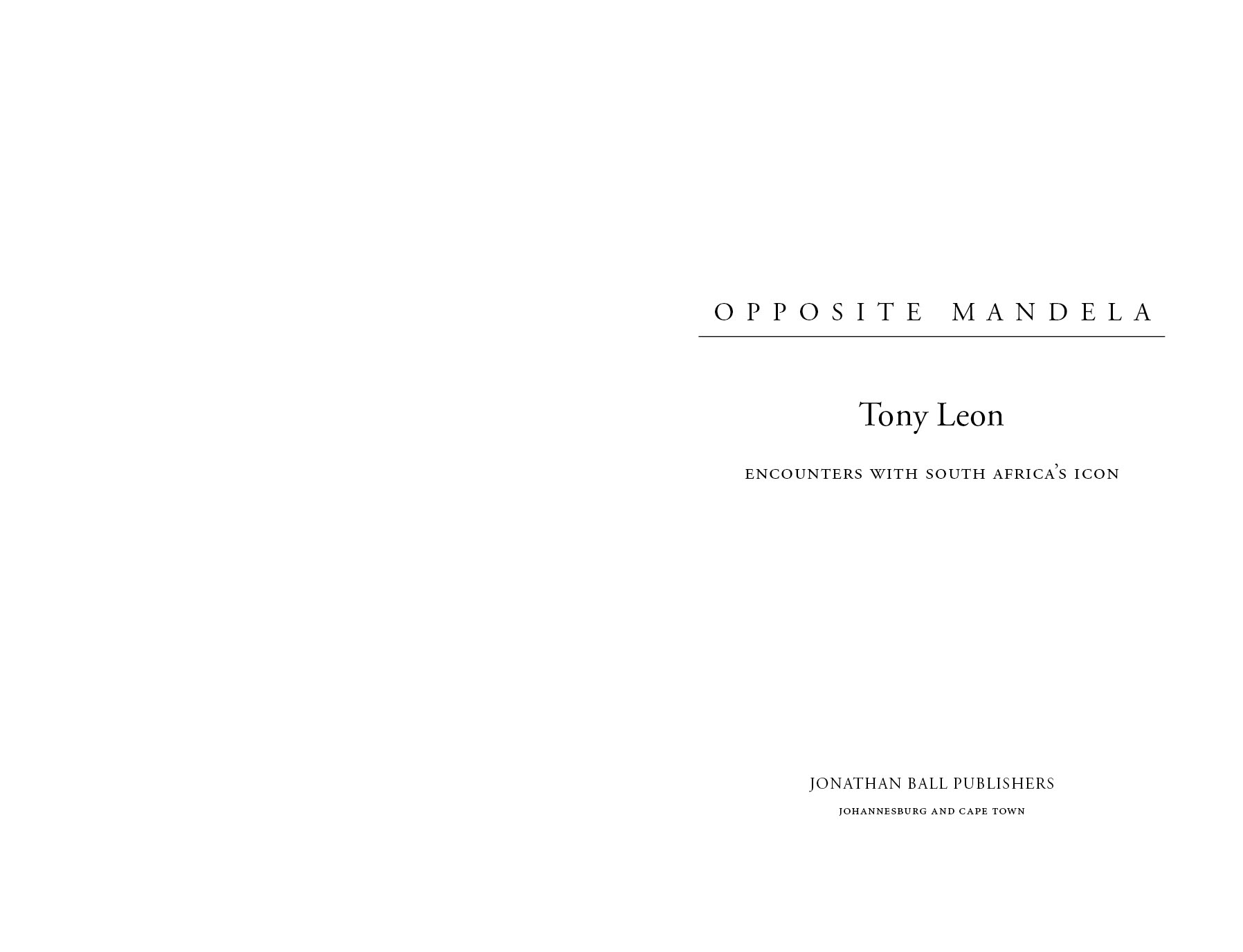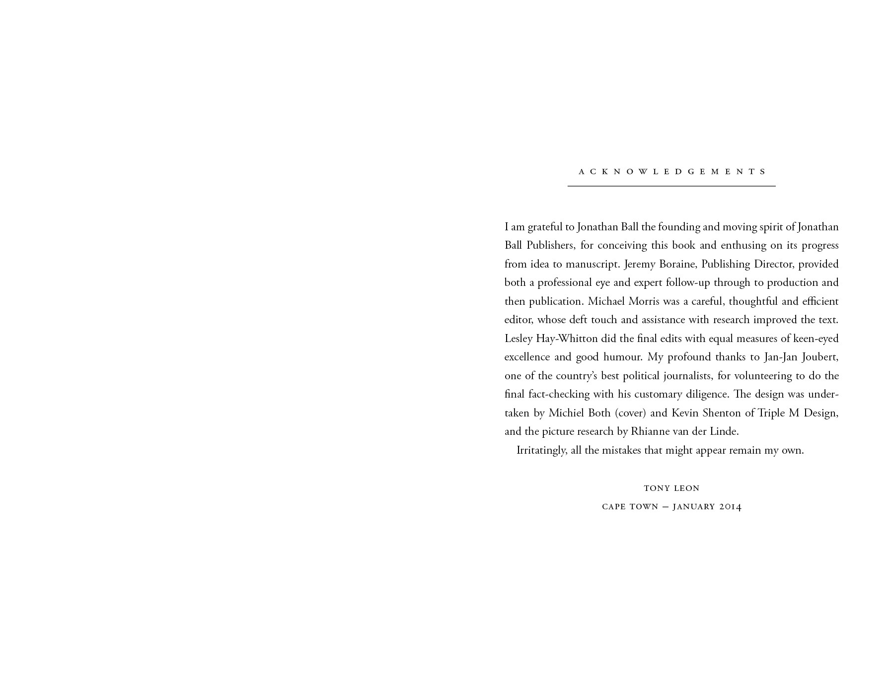 Design and typesetting by Triple M Design, Johannesburg Cover by Michiel Botha Printed and bound by Paarl Media, Paarl Set in 11,5/18 pt Adobe Garamond Pro Front cover photograph © Government Communication and Information System (GCIS) Back cover photograph © Gallo Images/Beeld/Halden Krog © Text Tony Leon, 2014 Originally published in South Africa in 2014 by JONATHAN BALL PUBLISHERS (PTY) LTD ISBN 978-1-86842-601-0 ebook ISBN 978-1-86842-602-7