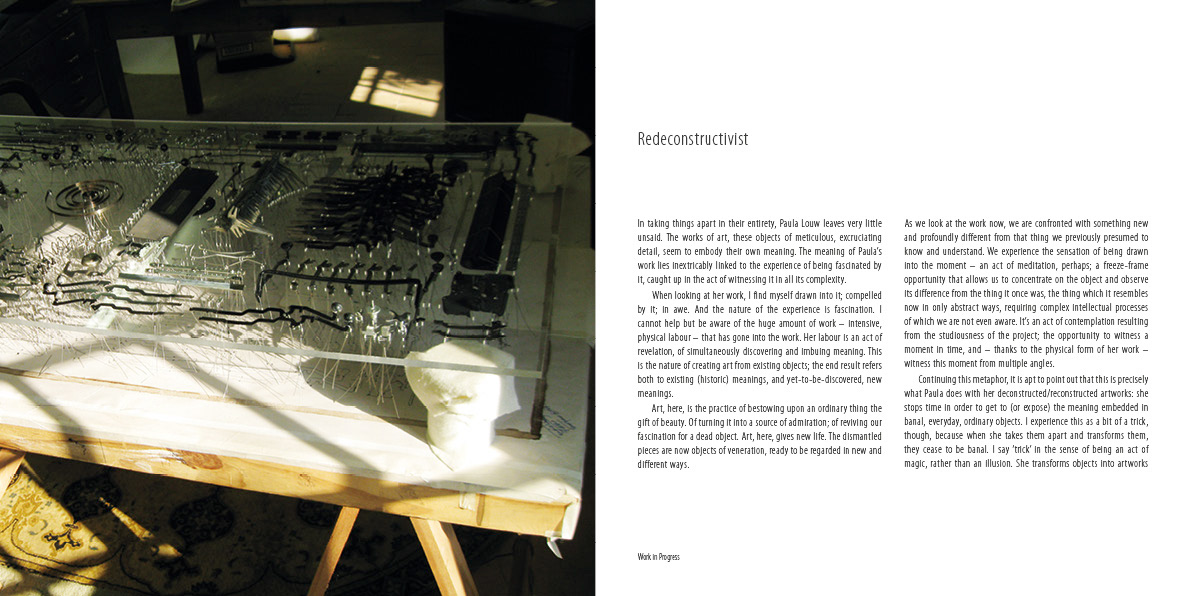 This exhibition catalogue was published in conjunction with the exhibition Paula Louw – Redeconstructivist at CIRCA Gallery, Johannesburg December 2011 Photographs by Rupert de Beer, John Hodgkiss and Paula Louw