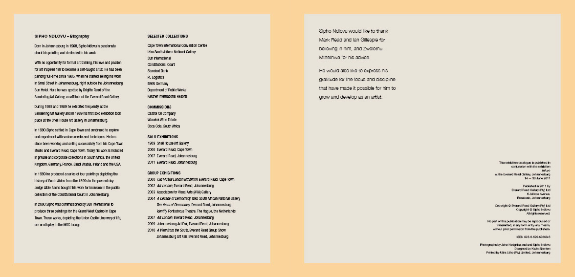 This exhibition catalogue was published in conjunction with the exhibition 'Imfuyo' at the Everard Read Gallery, Johannesburg June 2011 Photographs by John Hodgkiss and and Sipho Ndlovu Printed by Ultra Litho (Pty) Limited, Johannesburg
