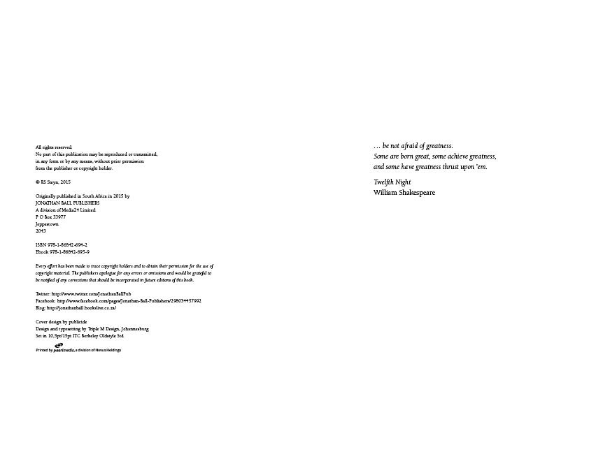 Originally published in South Africa in 2015 by JONATHAN BALL PUBLISHERS ISBN 978-1-86842-694-2 Design and typesetting by Triple M Design, Johannesburg