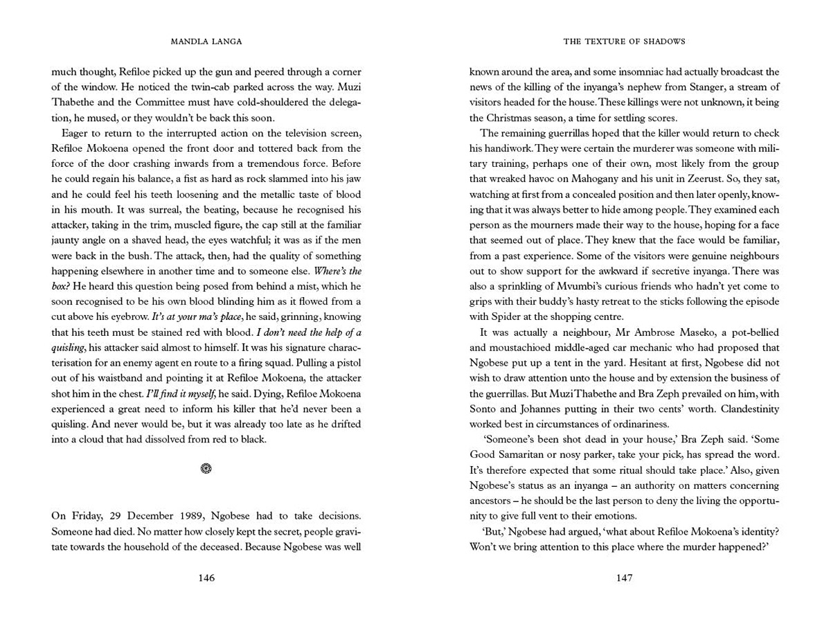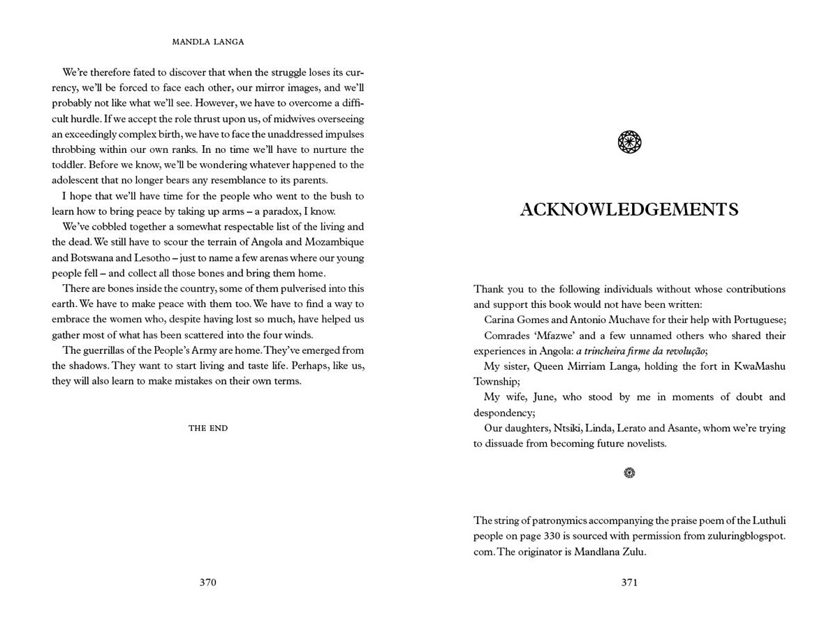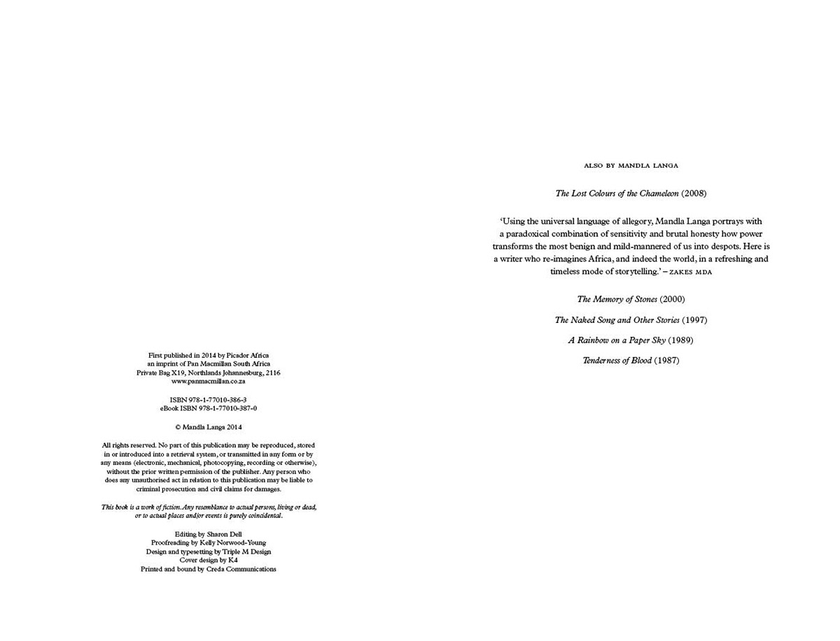 First published in 2014 by Picador Africa an imprint of Pan Macmillan South Africa ISBN 978-1-77010-386-3 eBook ISBN 978-1-77010-387-0 © Mandla Langa 2014 Design and typesetting by Triple M Design Cover design by K4 Printed and bound by Creda Communications
