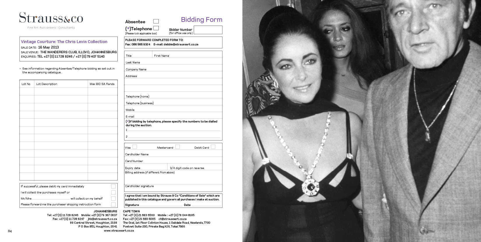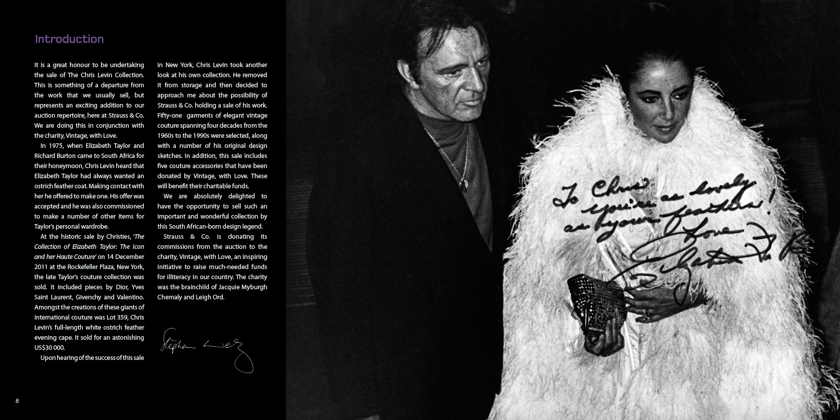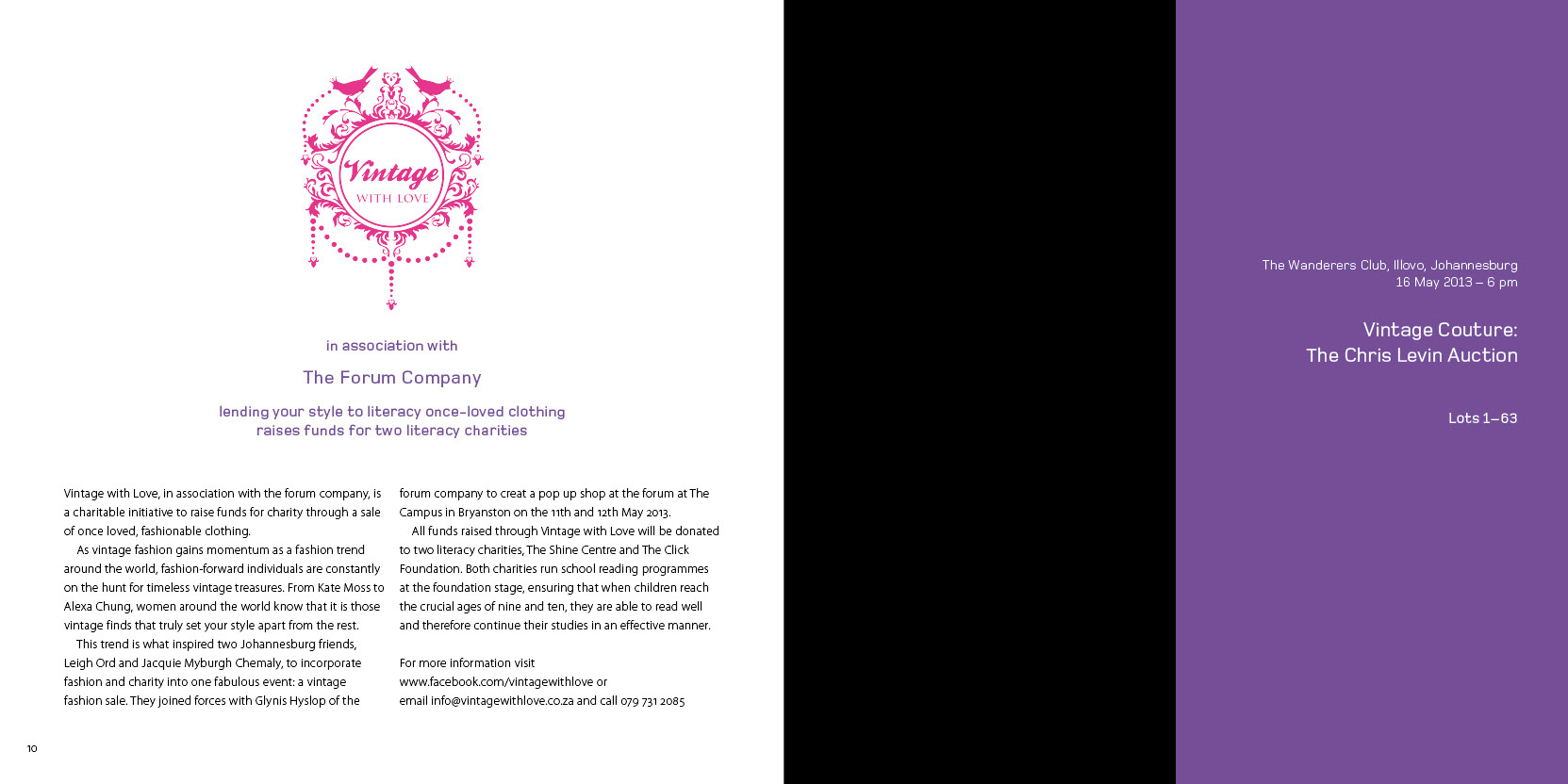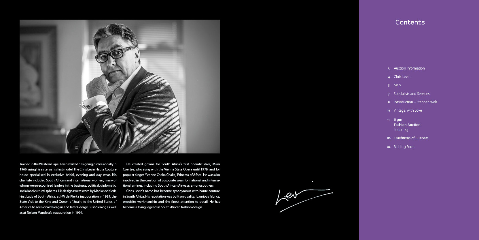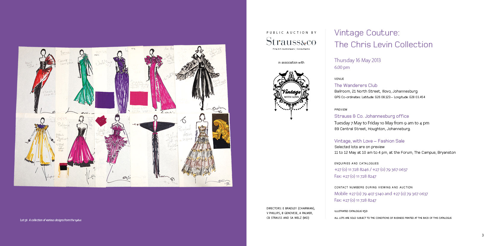 Vintage Couture Catalogue designed for an auction of Chris Levin's work from the 80's. Design and layout by Triple M Design Photography by James Fox, portrait of Chris Levin (page 2) by Andreas Vlachakis Printed by Ultra Litho (Pty) Limited, Johannesburg