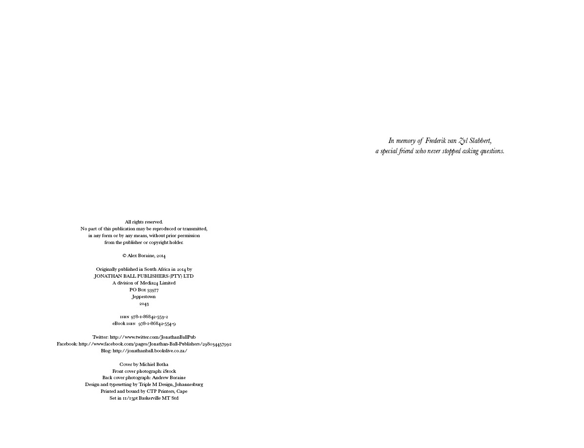 Originally published in South Africa in 2014 by JONATHAN BALL PUBLISHERS (PTY) LTD Cover by Michiel Botha Front cover photograph: iStock Back cover photograph: Andrew Boraine Design and typesetting by Triple M Design, Johannesburg Printed and bound by CTP Printers, Cape